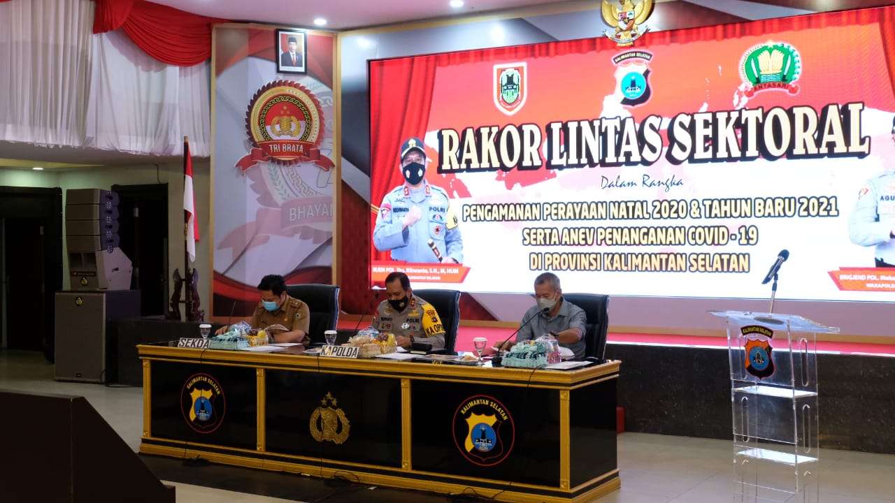 Dalam rangka mewujudkan Operasi Kepolisian Terpusat Lilin Intan 2020 Polda Kalsel yang bersinergi dengan Pemerintah Provinsi Kalsel dan Korem 101 Antasari serta pemangku kepentingan lainnya, maka Polda Kalsel pada hari Selasa tanggal 22 Desember 2020 di Aula Mathilda Batlayeri Polda Kalsel menyelenggarakan Rapat Koordinasi Lintas Sektoral dalam rangka perayaan Natal 2020 dan Tahun Baru 2021 serta Anev Penanganan Covid -19 di Provinsi Kalimantan Selatan.
